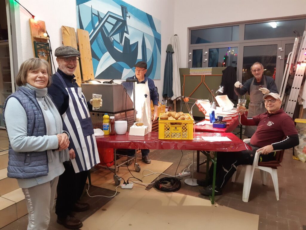 Startklar und gut organisiert für die zahlreichen Kinder und Erwachsene nach dem Sankt-Martinsumzug im protestantischen Gemeindehaus. Das Bratwurst-Team des Gönnheimer Bouleclubs: